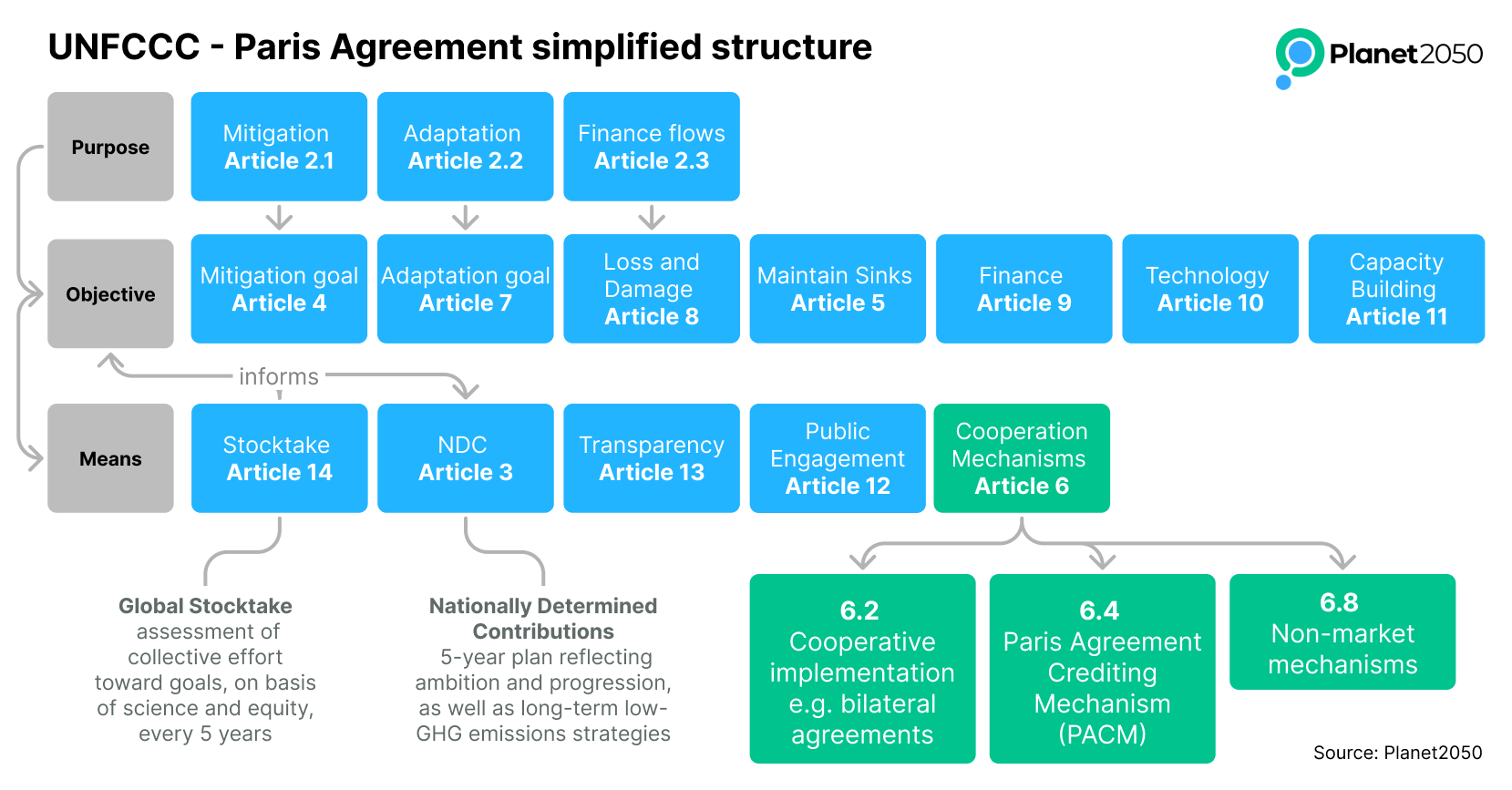 The Paris Agreement includes in total 16 introductory paragraphs and 29 articles. The following is a simplified view of the structure of the Paris Agreement with some of the main articles including Article 6 on cooperation mechanisms.