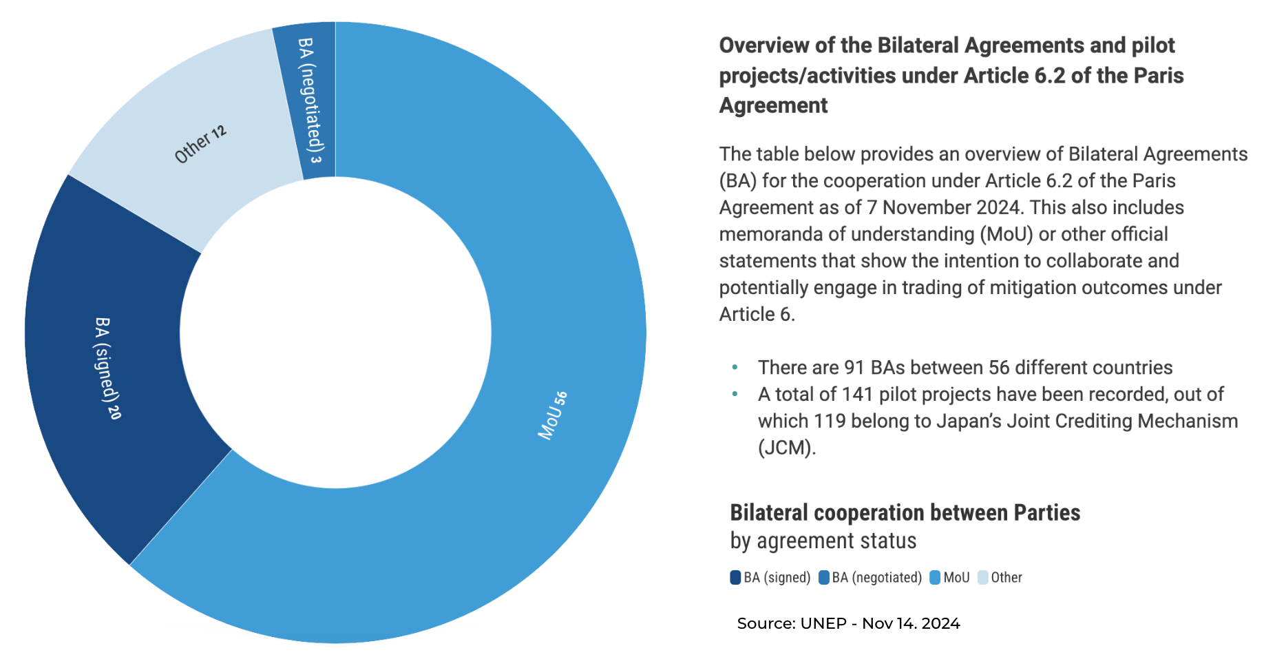 Article 6.2 has already started and is poised to take off significantly with countries signing new ITMO agreements. As of November 7, 2024, 91 bilateral agreements have been established among 56 nations, indicating a robust commitment to cooperative climate action. Full disclosure of information from the host countries is critical to the success of Technical Expert Reviews in accounting for additionality and transparency.