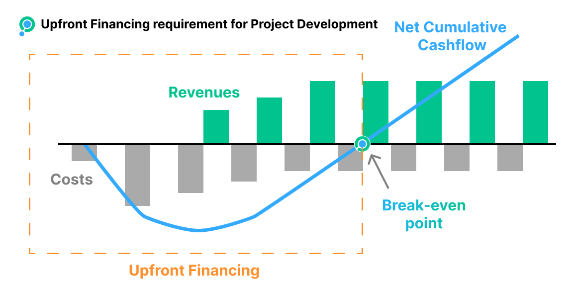 Project developers - the unsung heroes on the frontlines of climate action - frequently lack access to the Upfront Financing needed to kickstart their vital work. Many are forced to operate on limited resources and make difficult trade-offs until net cumulative cashflows (sum of costs - sum of revenues) becomes positive (break-even point) and their project becomes self-financed.