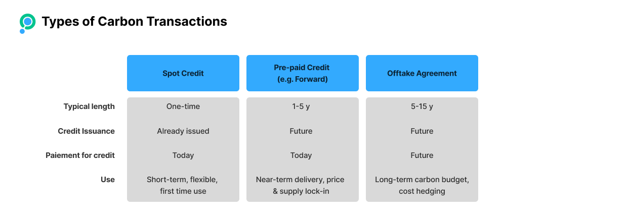 Spot Market Purchase: carbon buyers purchase immediately available, already-issued carbon credits. Think of "off-the-shelf" transactions. Here project developers can sell directly or through intermediaries (brokers, exchanges and marketplaces). Selling larger volumes usually means discounting prices but it also reduces credit transaction complexity and costs.
