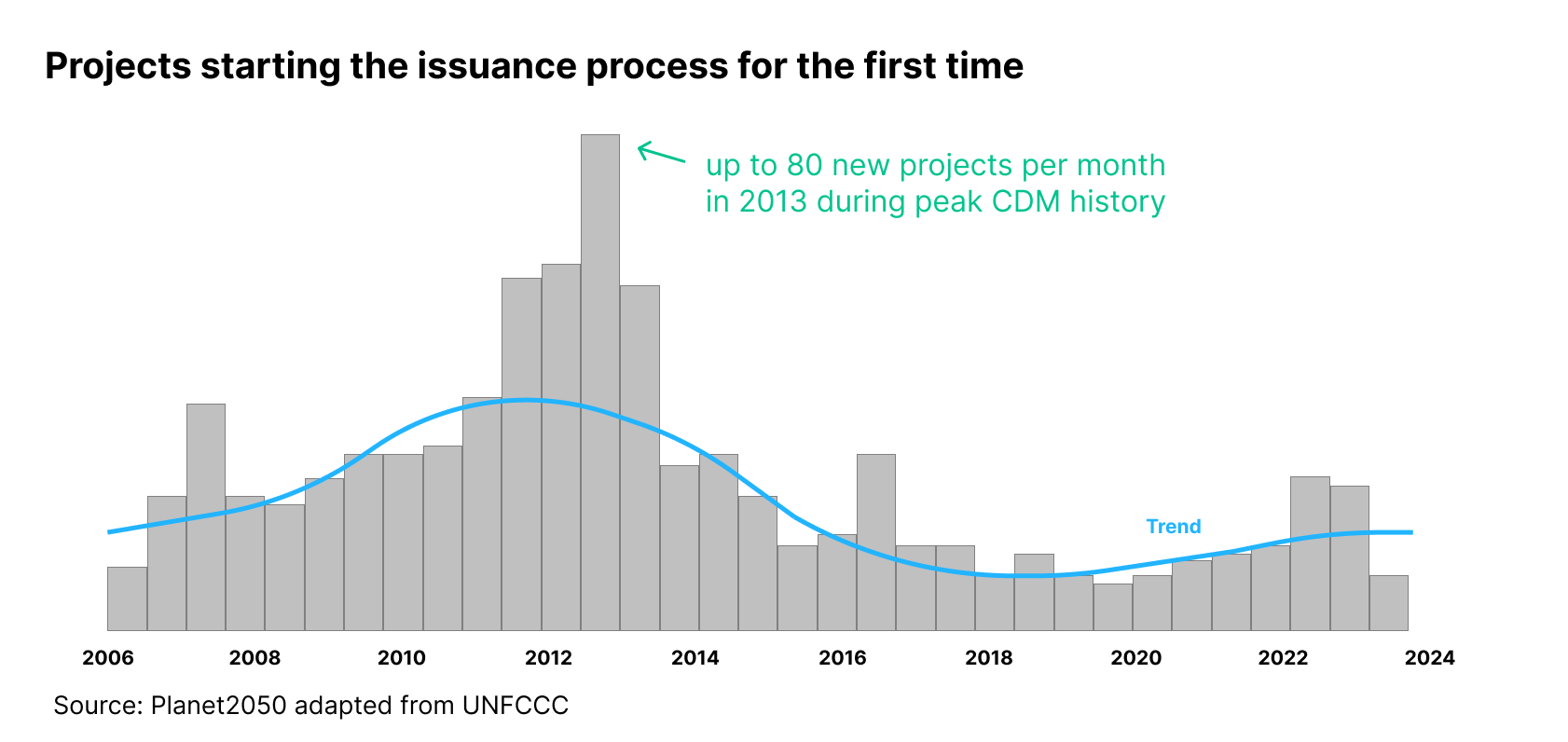 Die folgende Grafik veranschaulicht den klaren Höhepunkt des CDM zwischen 2010 und 2013 sowie eine leichte Erholung ab 2020–2021.