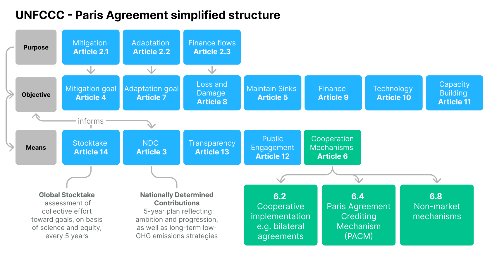 Das Pariser Abkommen umfasst insgesamt 16 einleitende Absätze und 29 Artikel. Die folgende Darstellung bietet eine vereinfachte Übersicht über die Struktur des Abkommens, einschließlich einiger zentraler Artikel wie Artikel 6 zu Kooperationsmechanismen.