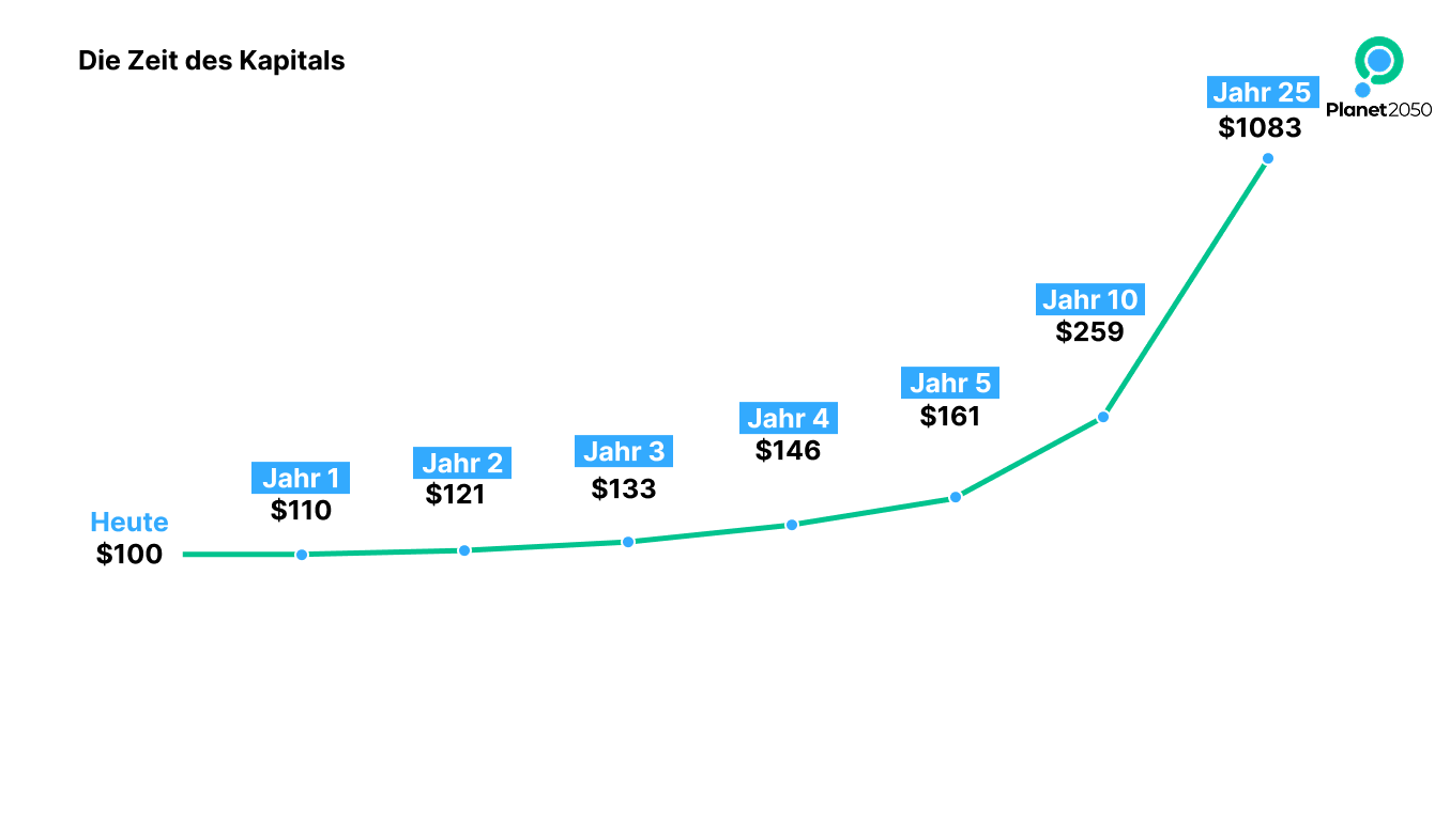 Man kann es auch so verstehen: Der heutige Wert von 100 USD über 25 Jahre sinkt deutlich, wenn man einen Zinseszinseffekt von 10 % jährlich einrechnet.