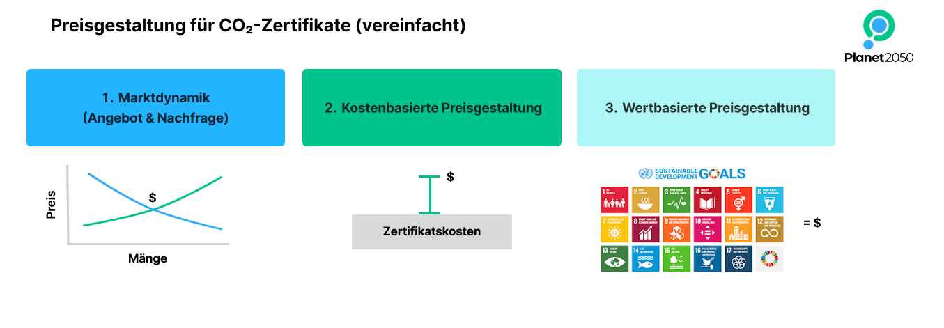 Theoretisch sollte der Preis eines CO2-Zertifikats, das tatsächlich eine Tonne CO₂ ausgleicht, mindestens dem sozialen CO₂-Kostenwert (Social Cost of Carbon, SCC) entsprechen, da dieser den vermiedenen gesellschaftlichen Schaden widerspiegelt. Wenn Zertifikate deutlich unter dem SCC gehandelt werden, trägt die Gesellschaft weiterhin versteckte Kosten für die anhaltenden Emissionen.