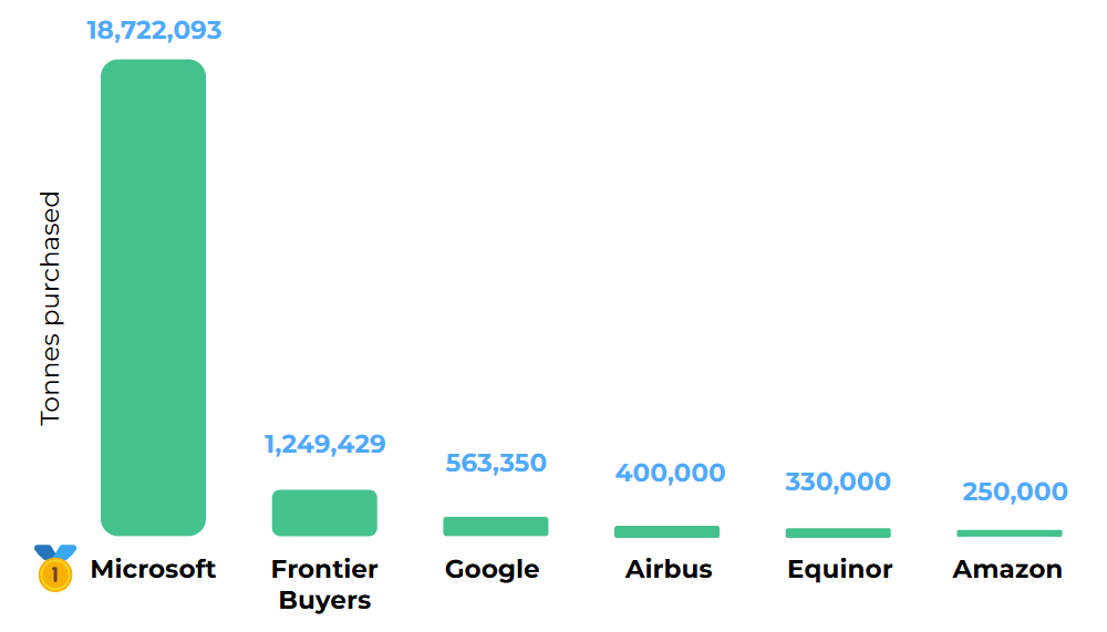 Im Jahr 2024 zeichnete Microsoft allein für 5,1 Millionen Tonnen CO₂ verantwortlich – das entsprach 63 % des weltweit gekauften CDR-Volumens in diesem Jahr (laut CDR.fyi).