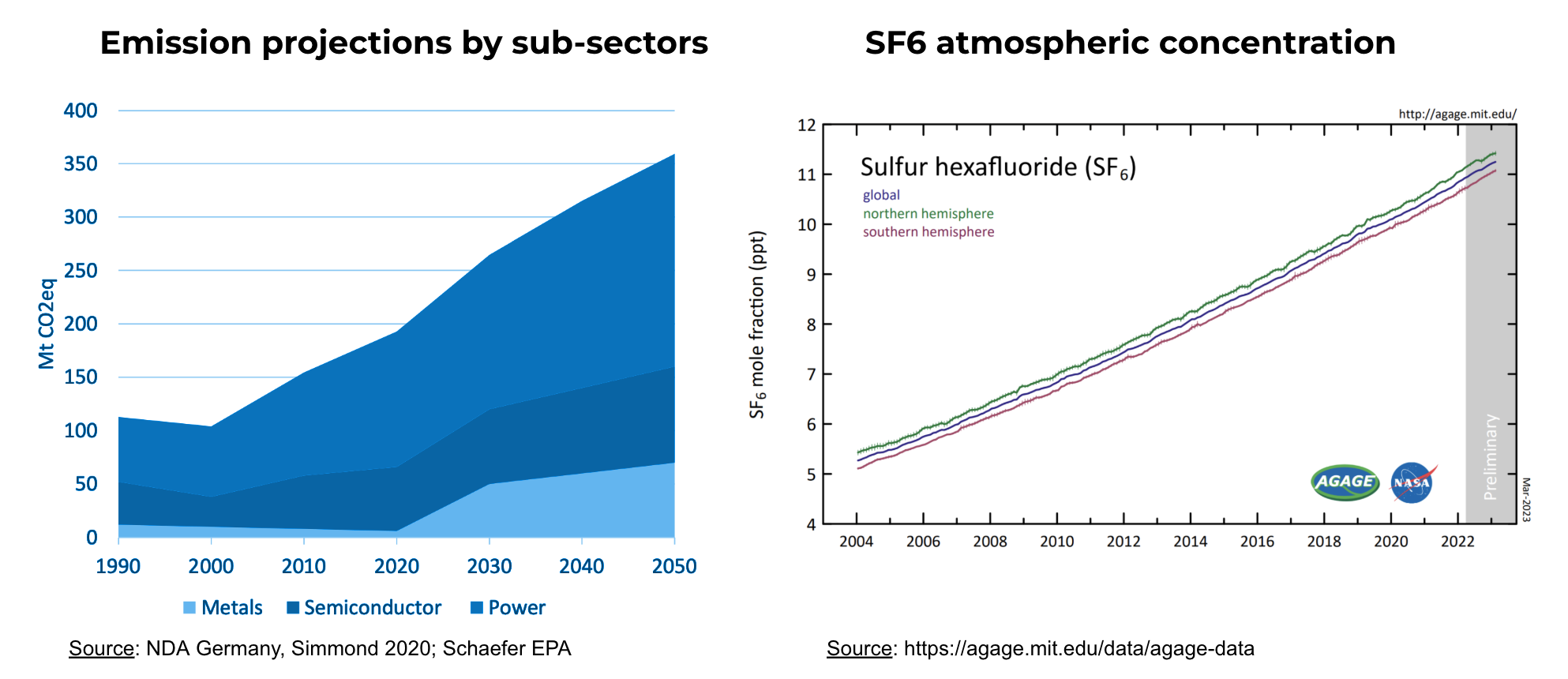 Die folgende Grafik gibt einen Überblick über die Emissionsprognosen und die atmosphärische Konzentration von SF6.