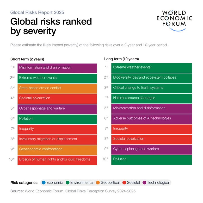 The annual published ahead of the event highlighted that over the last two decades, environmental risks have increased to represent the greatest source of long-term concern. This is according to the perception of the Forum's 2025 Global Risks respondents. More on this report in this .